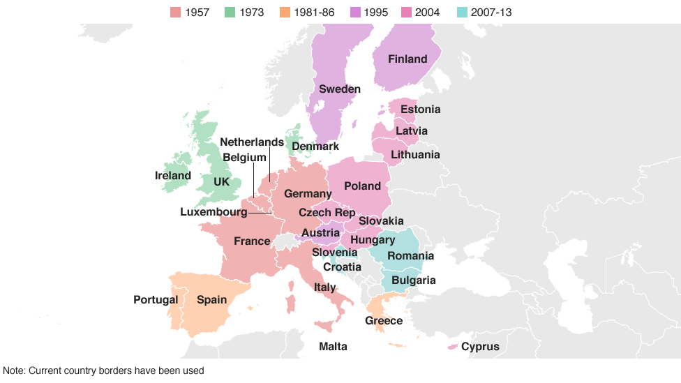 The European Union (EU) is just that: a union between the European countries. The EU stretches across Europe, from Finland to Cyprus. Shortly after World War II, France and Germany thought up a plan that would ensure an alliance between the European countries. The Netherlands, Belgium, Luxembourg, Italy, and little Malta also signed off on this plan. What started as six united countries, soon grew into an even stronger alliance amongst twenty-eight European nations. Although the EU was founded in 1957, Great Britain had not entered the EU until 1973, along with Ireland and Denmark.